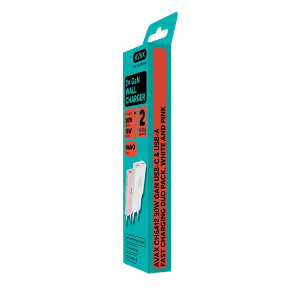 AVAX CH6412 30W GaN USB-C és USB-A gyorstöltő Duo csomag, fehér+rózsaszín