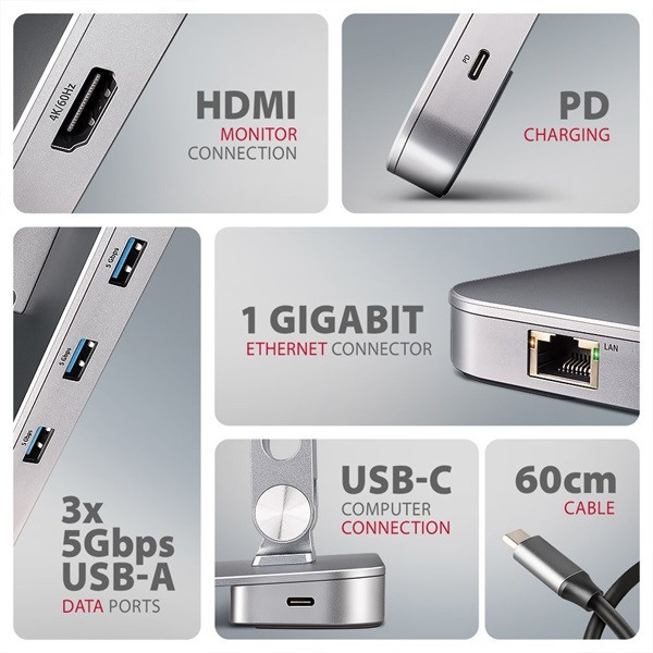 Az AXAGON HMC-STND 7in1 Hub & Stand egy egyedülálló multifunkciós hub, amely egy laptop- vagy táblagép-állványba van integrálva. Ez a hub további hat porttal bővíti laptopját vagy táblagépét. A laptopot egy 60 cm hosszú USB-C <-> USB-C kábelen keresztül csatlakoztatja a hubhoz. Ez azonnali csatlakozást biztosít egy monitor, három USB-eszköz, egy RJ-45 csatlakozó Gigabit Ethernet és Power Delivery számára. A két ízülettel állvány javítja az ergonómiát és a munkakényelmet, 10" és 16" közötti eszközökhöz alkalmas. Ideális 7in1-ben dokkolóállomás Windows laptopokhoz és Apple MacBook Air vagy MacBook Pro számítógépekhez.
