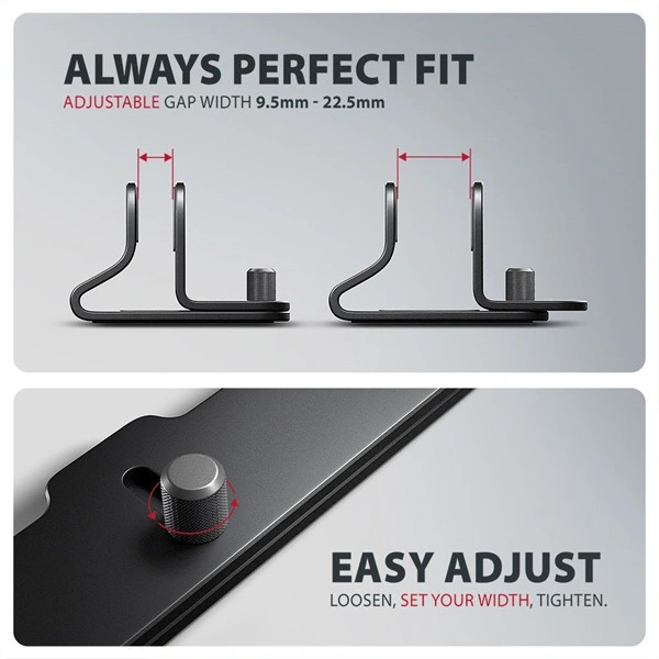 Előnye az állítható állvány 9.5 mm és 25.5 mm között, amelynek köszönhetően a legtöbb notebook könnyedén behelyezhető. A beállított szélességet egy precízen megmunkált állítócsavar megbízhatóan rögzíti, amely stabilan fixálja a kívánt pozíciót.