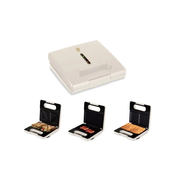 A készülék háromféle levehető lappal rendelkezik: grill, szendvics és gofri, így bármilyen ételt könnyedén elkészíthet. A hűvös tapintású külső és a biztonságos záró kar garantálja a biztonságos használatot.