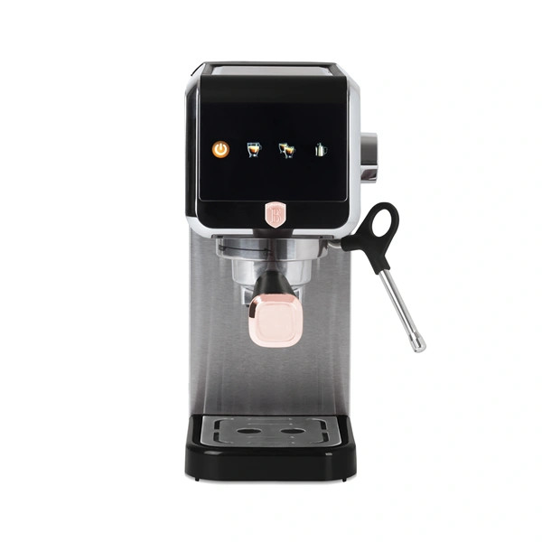 Az Espresso digitális kijelzős kávéfőző a Black Rose Collection része, amely a modern konyhák elengedhetetlen kelléke. Ez a kávéfőző nemcsak a funkcionalitásával, hanem a stílusával is lenyűgöz. A rozsdamentes acél és a fekete-rose gold színkombináció elegáns megjelenést kölcsönöz neki, így bátran kihelyezheted a konyhapultra, nem kell elrejtened a fiókban.