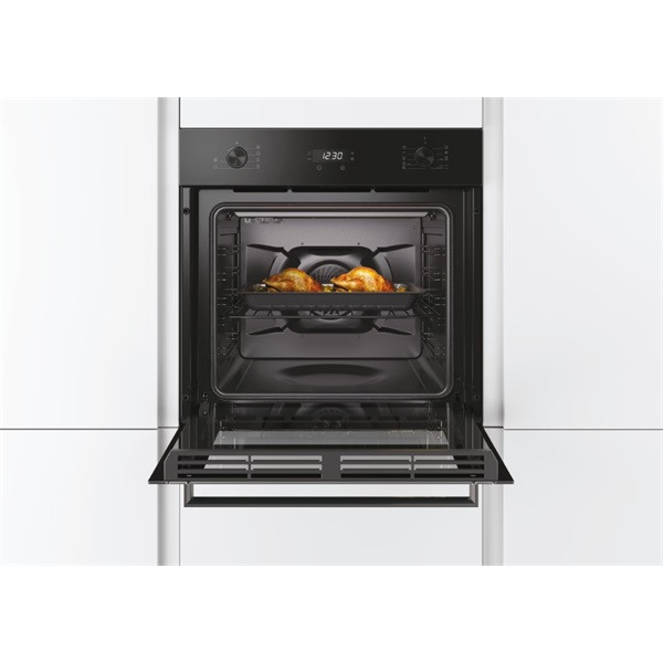 - A fekete üveg ajtó és a fekete színű kezelőpanel stílusos megjelenést biztosít, miközben a Softclose ajtómechanizmus kényelmes használatot kínál. Az integrált tisztítórendszer révén a sütő tisztítása egyszerű, míg az energiatakarékos üzemmód segít csökkenteni a fogyasztást.