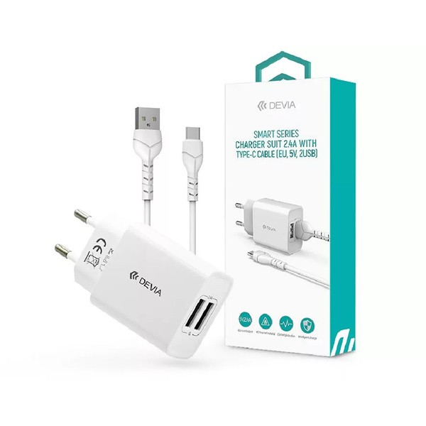 Devia ST364037 2xUSB 2,1A fehér hálózati töltő adapter + USB - Type-C 1m kábel