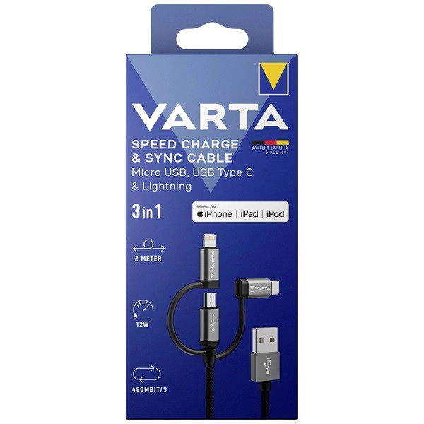 Varta 57937101111 2m 12W 3in1 USB A - Lightning/microUSB/Type C adat- és töltőkábel
